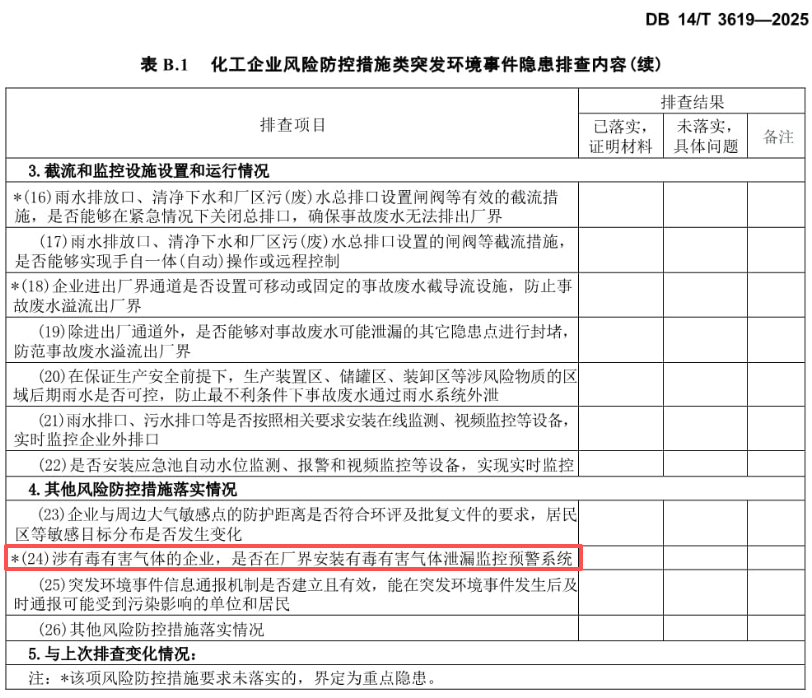 《DB14/T 3619—2025 化工企业突发环境事件风险隐患排查技术指南》明确指出,所有涉及有毒有害气体生产、使用、储存的化工企业,都必须在厂界安装实时监测预警系统,具体要求包括: